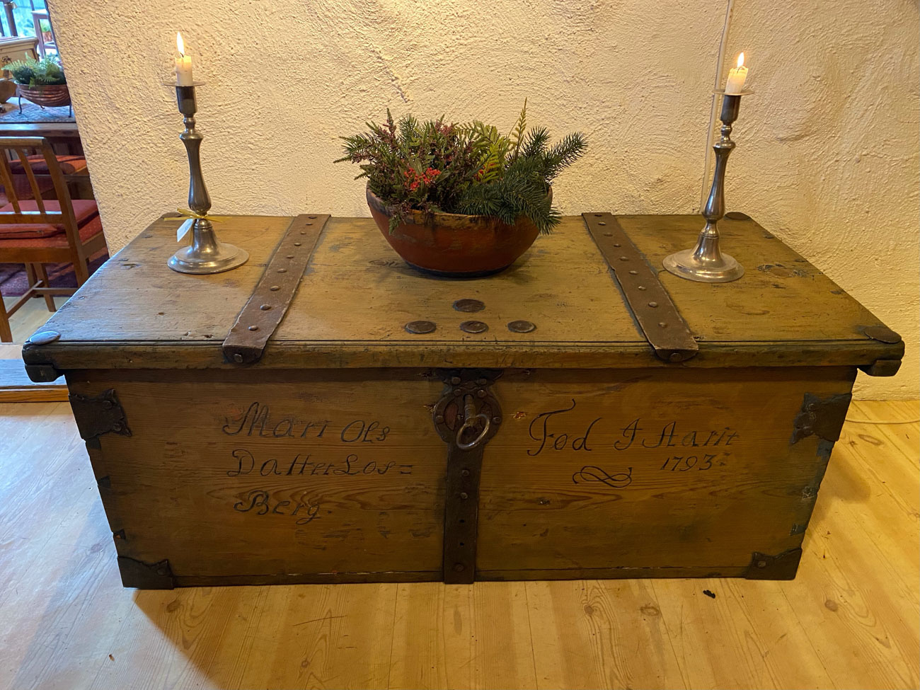 Kiste fra Hardanger med fine jernbeslag, navn og årstall 1793 (lengde 113, bredde 56, høyde 45 cm) PRIS KR 9.000